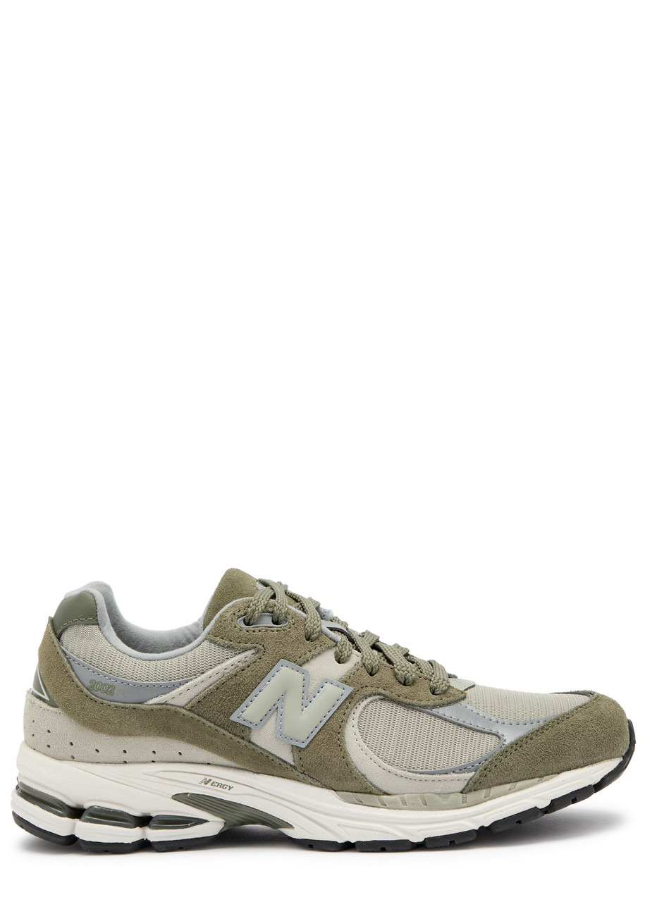 Info & Care New Balance mesh sneakers Designer plaque at padded tongue, padded ankle, suede and leather panels, designer plaque at sides, 2002R print at side, perforated details, designer plaque at heel, logo embroidery at front, ACTEVA LITE sculpted midsole, rubber sole, round toe; Lace-up front;