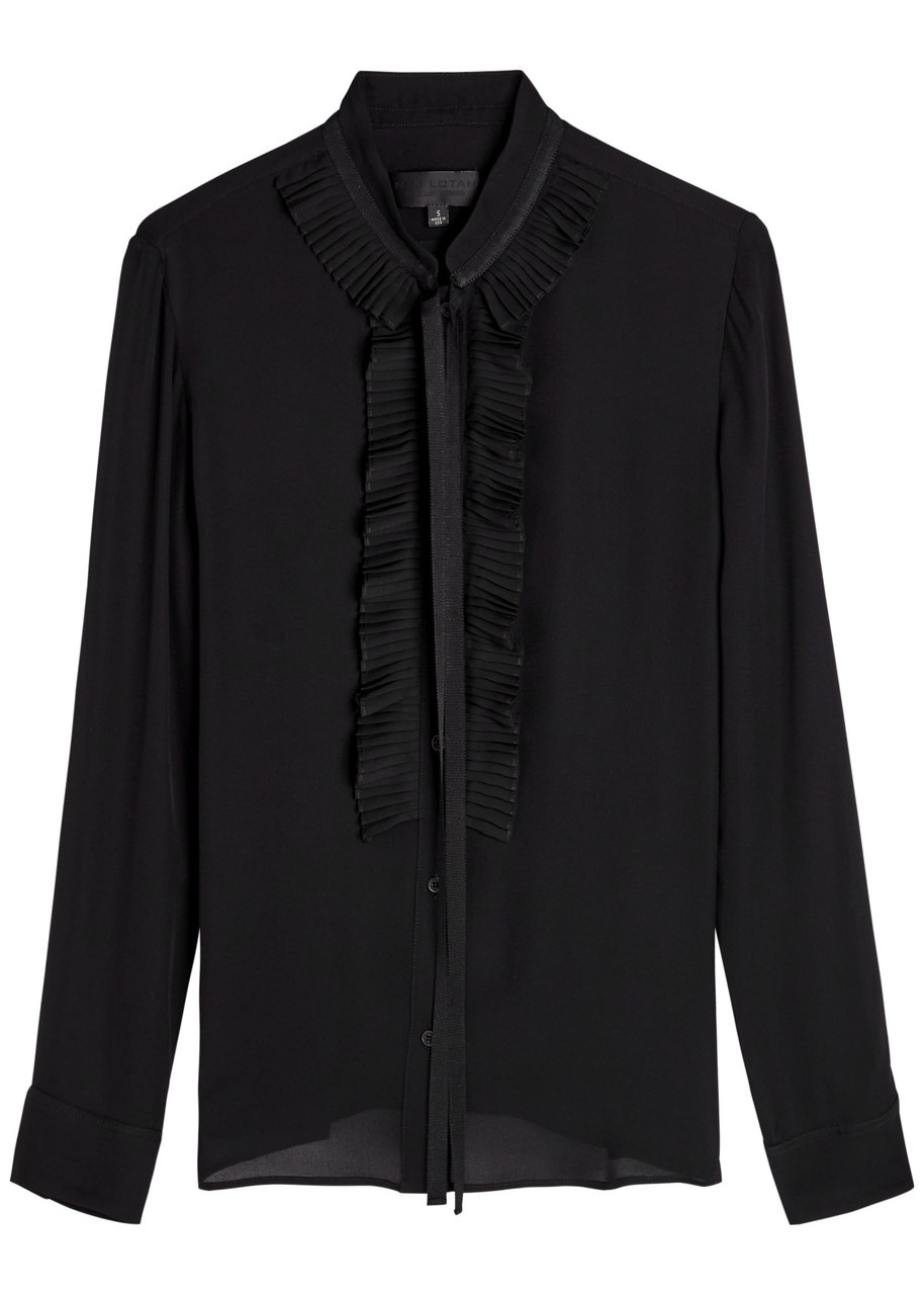 Info & Care Nili Lotan silk-chiffon;blouse Ruffled trim, tie-fastening stand collar, button-fastening cuffs, curved hem Button fastenings through front 100% silk Dry clean Size & Fit Length shoulder to hem: 25 inches/ 63.5cm Midweight Loose fit Model is 5'10"/ 178cm and wears a size small