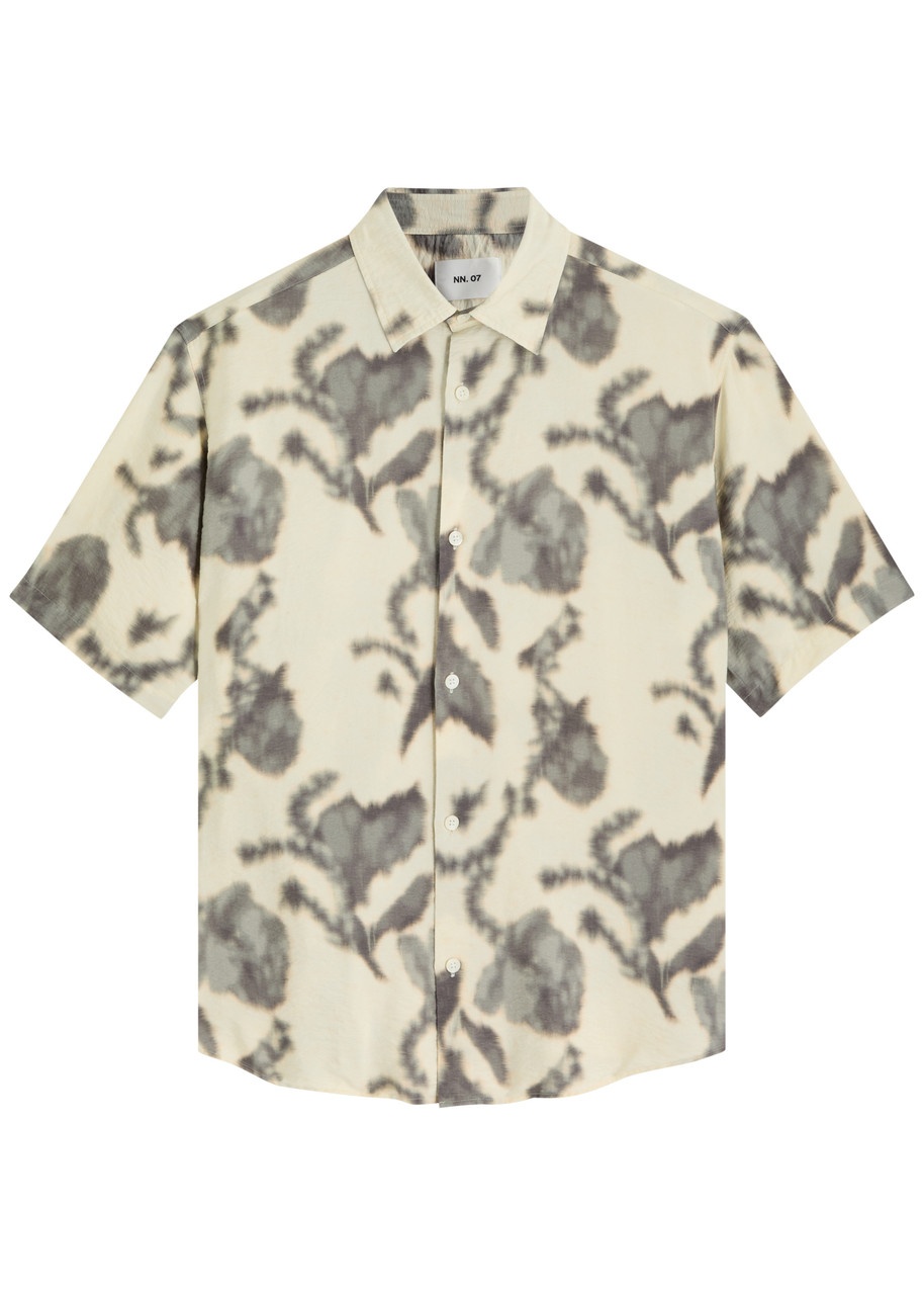 Info & Care NN.07 twill shirt Printed, designer tab at side, curved hem, longer back hem, crinkled finish Button fastenings through front; 88% modal, 12%;polyamide Machine wash Size & Fit Length shoulder to hem: 28.5 inches/ 72.5cm; back: 30.5 inches/ 77.5cm Midweight Relaxed fit Model is 6'1"/ 185cm, chest size 38 inches and wears a size medium;
