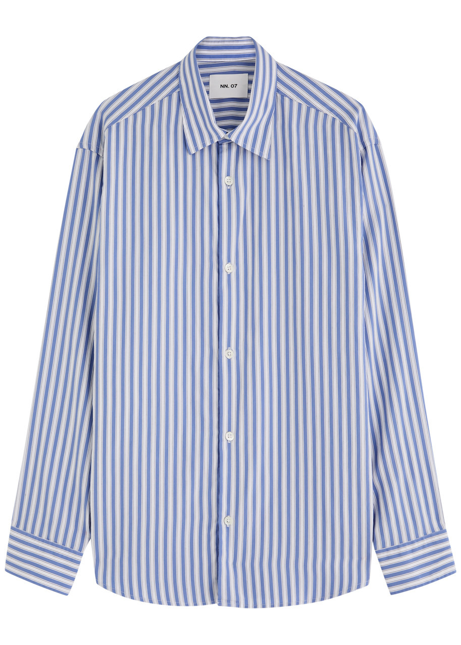 Info & Care NN.07 modal-blend shirt; Striped print, dropped shoulders, button-fastening keyhole cuffs, designer tag at side, curved hem, longer back hem Button-fastenings through front 88% modal, 12% polyamide Machine wash; Size & Fit Length shoulder to hem: 30 inches/ 76cm; back: 31 inches/ 79cm Midweight; Slightly relaxed fit; Model is 6'3"/ 191cm, chest size 38 inches and wears a size medium