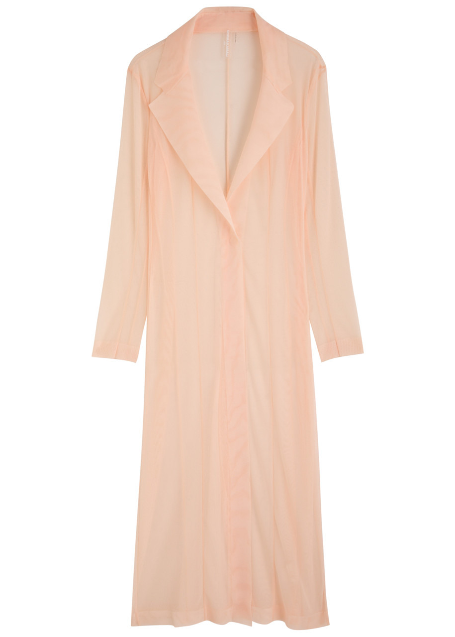 Info & Care Norma Kamali mesh coat; Notched lapels, darted, raw hem Velcro fastening at front 82% nylon, 18% spandex Machine wash cold Size & Fit Length shoulder to hem: 50 inches/ 127cm Midweight Slim fit Model is 5'10"/ 178cm and wears a size small