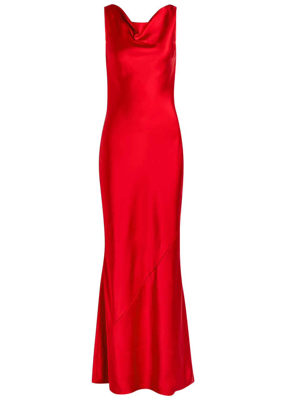 Info & Care Norma Kamali satin dress Draped, wide-neck, low back Slips on 100% polyester Hand wash; Size & Fit Length shoulder to hem: 60 inches/ 152.5cm Midweight Slim;fit Model is 5'9"/ 175cm and wears a size small