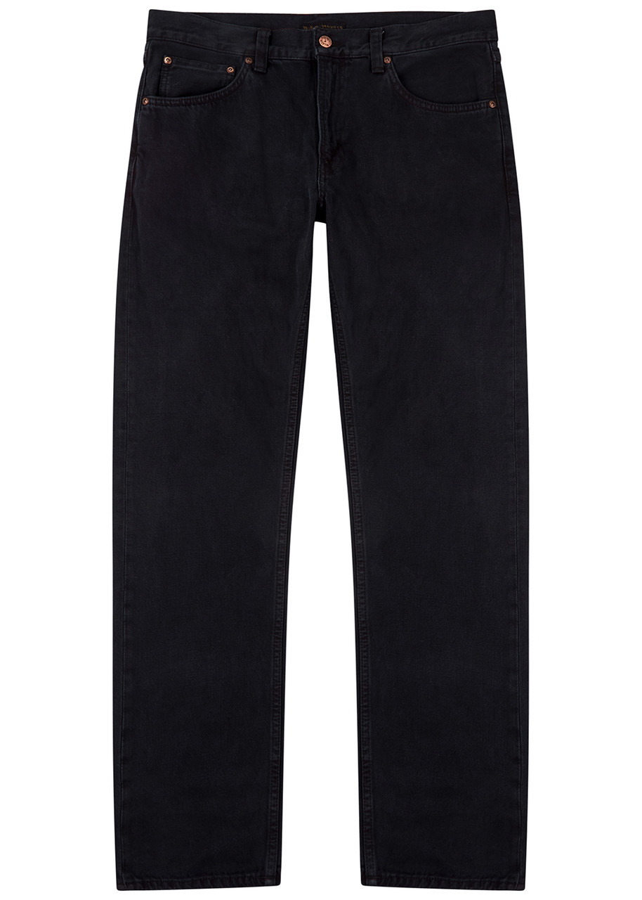 INFO & CARE - Nudie Jeans black denim jeans - Mid-rise fit straight-leg cut five pockets belt loops designer plaque slightly faded finish - Concealed zip and button fastening at front - Designer wash: Black Forest - 100% cotton SIZE & FIT - Machine wash cold inside out to avoid colour transfer - Inside leg length: 31.5 inches/ 80cm - Front rise: 10 inches/ 25.5cm - Midweight - Model is 6'2"/ 188cm and wears a size UK W32