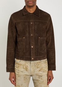 Info & Care Nudie Jeans suede jacket Pleats through front, button-fastening cuffs, front patch pockets, designer plaque, button-fastening tabs at adjustable back hem, designer-engraved hardware Button fastenings through front 100% goat leather Dry clean; Size & Fit Length shoulder to hem: 23 inches/ 58.5cm Midweight Boxy fit Model is 6'2"/ 188cm, chest size 38 inches and wears a size medium