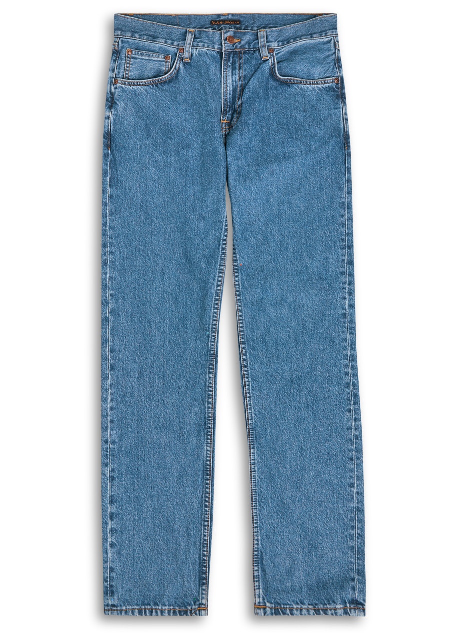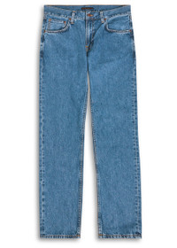 Info & Care Nudie Jeans denim jeans Mid-rise fit, straight-leg cut, belt loops, five pockets, contrast stitching, designer plaque at back, designer-engraved hardware, signature stitching at back pockets, washed finish; Partially concealed zip and button fastenings at front Designer wash:;Morning Mist 100% cotton Machine wash cold inside out to avoid colour transfer; Size & Fit Front rise: 10.5 inches/ 26.5cm Inside leg length: 31 inches/ 79cm; Midweight Model is 6'1"/ 185cm and wears a size medium