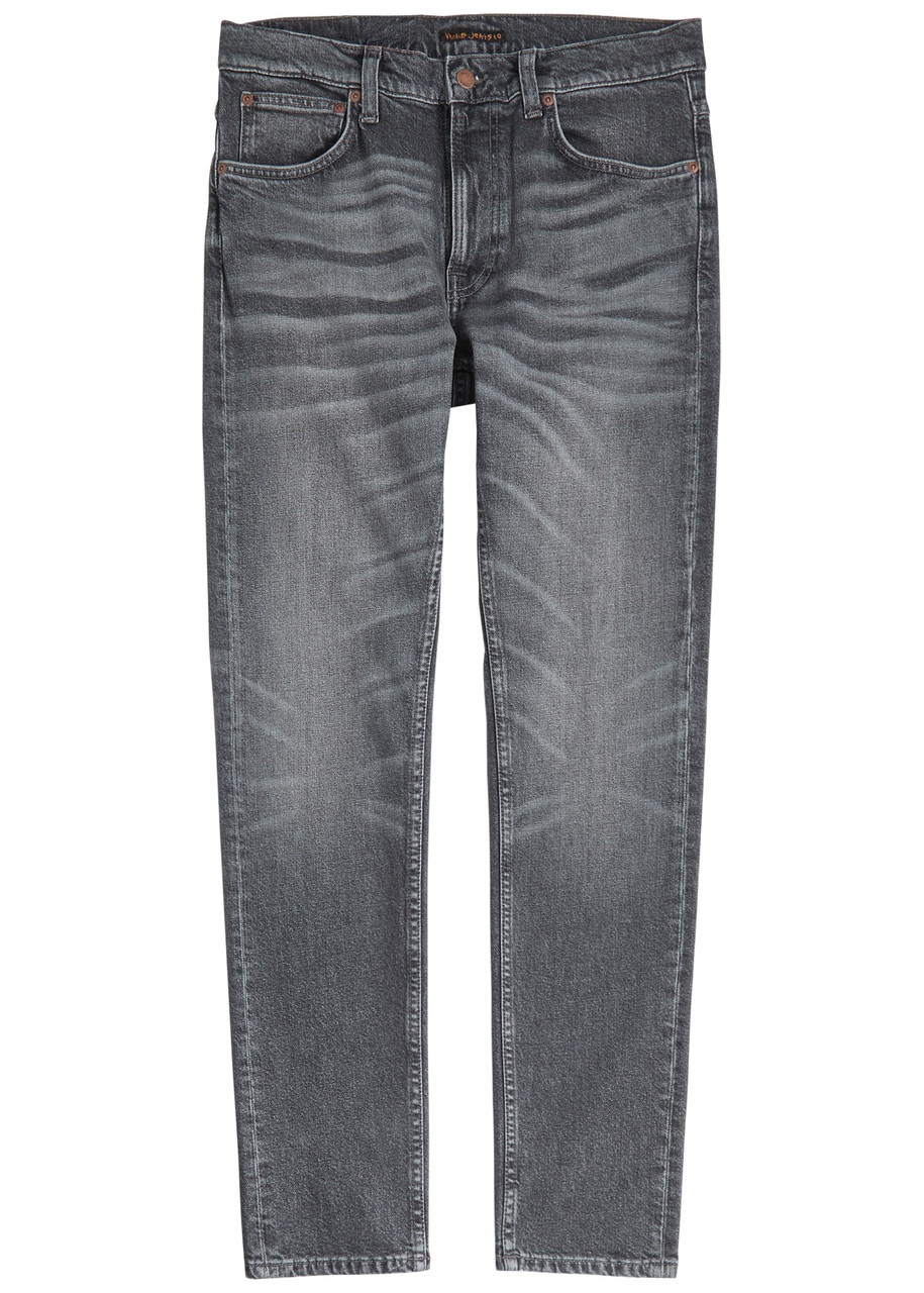 Info & Care Nudie Jeans stretch-denim jeans Mid-rise fit, slim-leg cut, belt loops, five pockets, designer plaque at back, signature stitching at back pockets, whiskered, faded finish Designer wash:;Grey Hurricane Partially concealed zip and button fastening at front; 99% cotton, 1% elastane; Machine wash cold inside out to avoid colour transfer Size & Fit Front rise: 10.5 inches/ 27cm Inside leg length: 31.5 inches/ 80cm Midweight Model is 6'3"/ 191cm and wears a size W32
