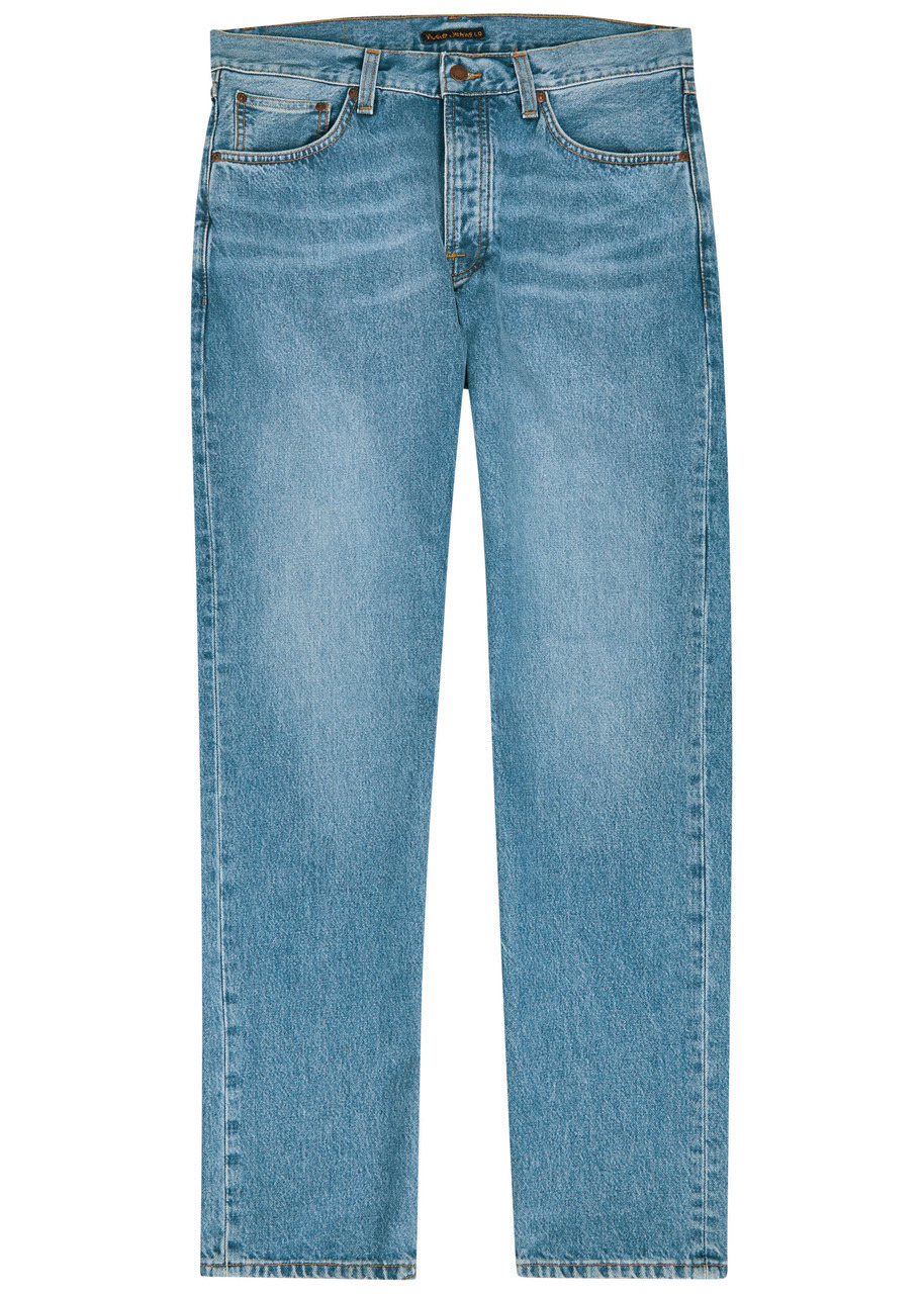 Info & Care Nudie Jeans denim jeans Mid-rise fit, straight-leg cut, belt loops, five pockets, designer plaques at back, signature stitching at back pockets, slightly distressed details, whiskered and faded finish Designer wash: Indigo Blues; Partially concealed button fastenings at front 100% cotton Machine wash cold inside out to avoid colour transfer Size & Fit Front rise: 11 inches/ 28cm Inside leg length: 32 inches/ 81.5cm Midweight Model is 6'2"/ 188cm and wears a size W32