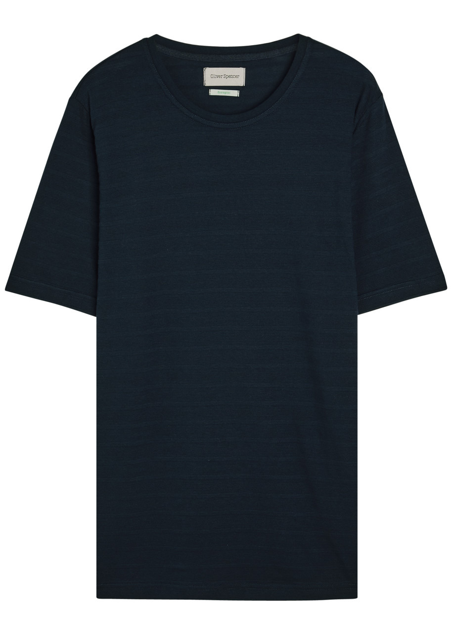 Info & Care Oliver Spencer knit T-shirt; Striped details, ribbed crew-neck, designer tag at side Slips on; 45% cotton, 45% modal, 8% polyester, 2% elastane; Machine wash; Size & Fit Length shoulder to hem: 27 inches/ 68.5cm Midweight; Slightly relaxed fit; Model is 6'2"/ 188cm, chest size 38 inches and wears a size medium