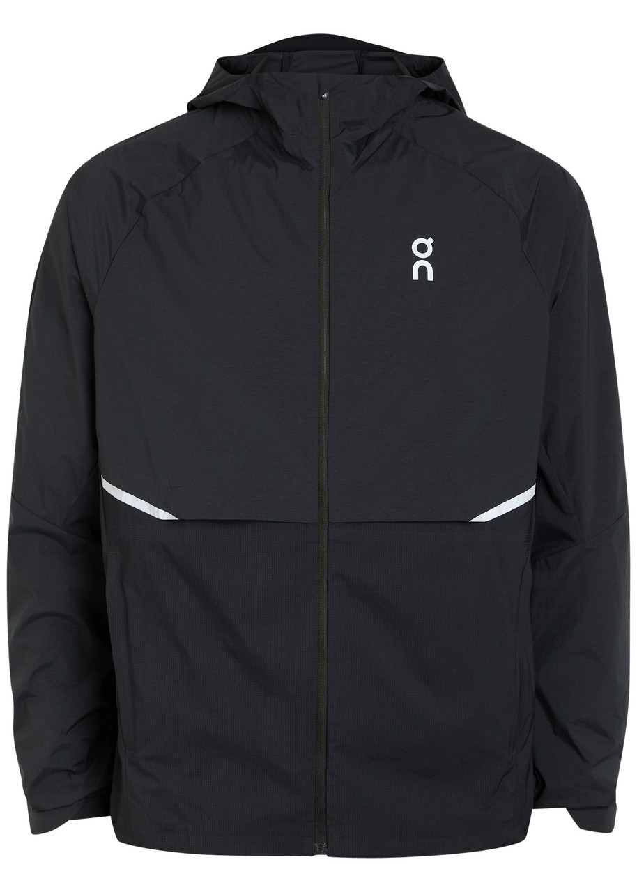 Info & Care On stretch-nylon jacket Hood with peak, high-neck, raglan sleeves, partially elasticated cuffs, logo stamp at front and back, zip-fastening side pockets,;front and back ventilations flaps, reflective details, internal toggle-fastening hem, mesh lining Zip-fastening through front Fabric 1: 87% polyamide, 13% elastane; fabric 2: 92% polyamide, 8% elastane; lining: 95% polyamide, 5% elastane Machine wash Size & Fit Length shoulder to hem: 27 inches/ 68.5cm Midweight Regular fit Model is 6'0"/ 183cm, chest size 38 inches and wears a size medium