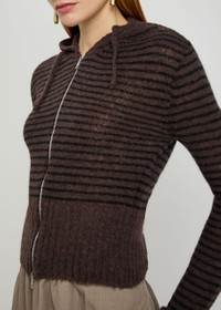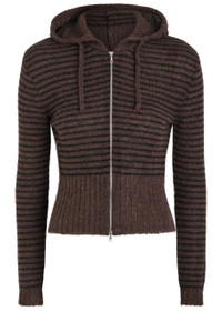 Info & Care Our Legacy brushed alpaca-blend jumper Striped, drawstring hood, ribbed trims Two-way zip fastening through front 55% alpaca wool, 30% polyamide, 15% wool Hand wash Size & Fit Length shoulder to hem: 20 inches/ 51cm Midweight Slim fit Model is 5'9"/ 175cm and wears a size;FR36