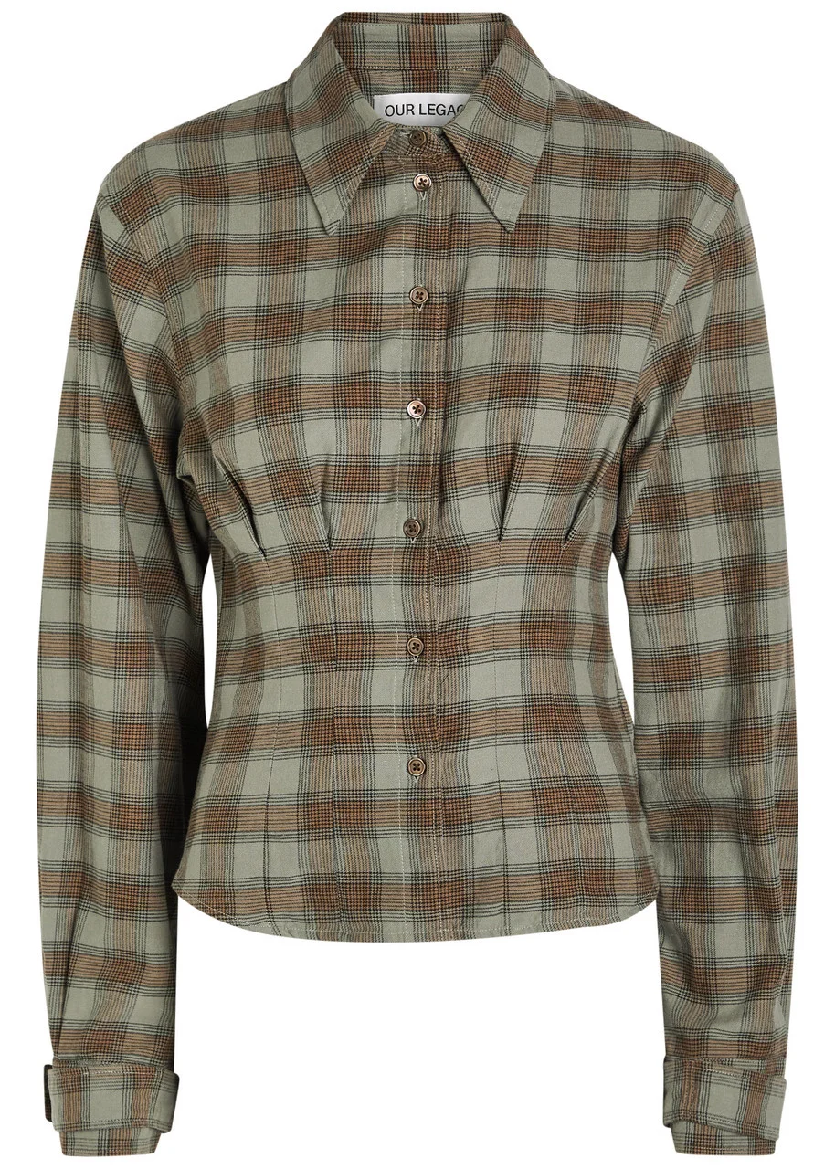 Info & Care Our Legacy cotton shirt Plaid, press-stud fastening tab at button-fastening cuffs, pleats at darted waist, box pleat at back, curved hem Button fastenings through front 100% cotton Machine wash Size & Fit Length shoulder to hem: 22 inches/ 56cm Midweight Regular fit, fitted at the waist Model is 5'9"/ 175cm and wears a size;FR36