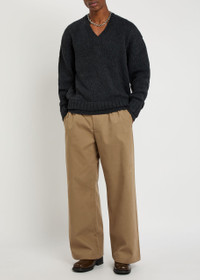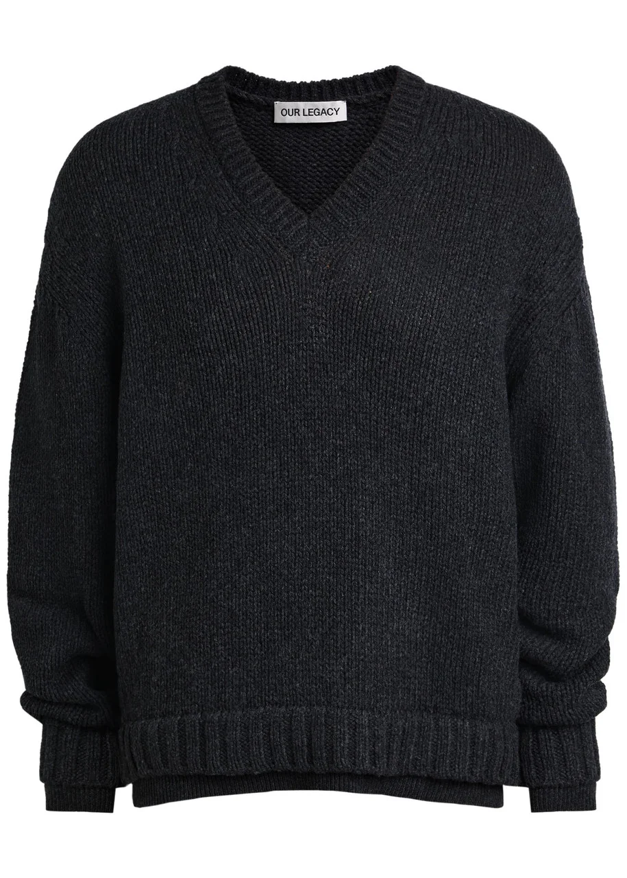 Info & Care Our Legacy merino wool;jumper V-neck,;dropped shoulders, double-layered cuffs and hem,;ribbed trims Slips on 100% merino wool Hand wash Size & Fit Length shoulder to hem: 27 inches/ 68.5cm Midweight Relaxed fit Model is 6'1"/ 185cm, chest size 38.5 inches and wears a size;IT48