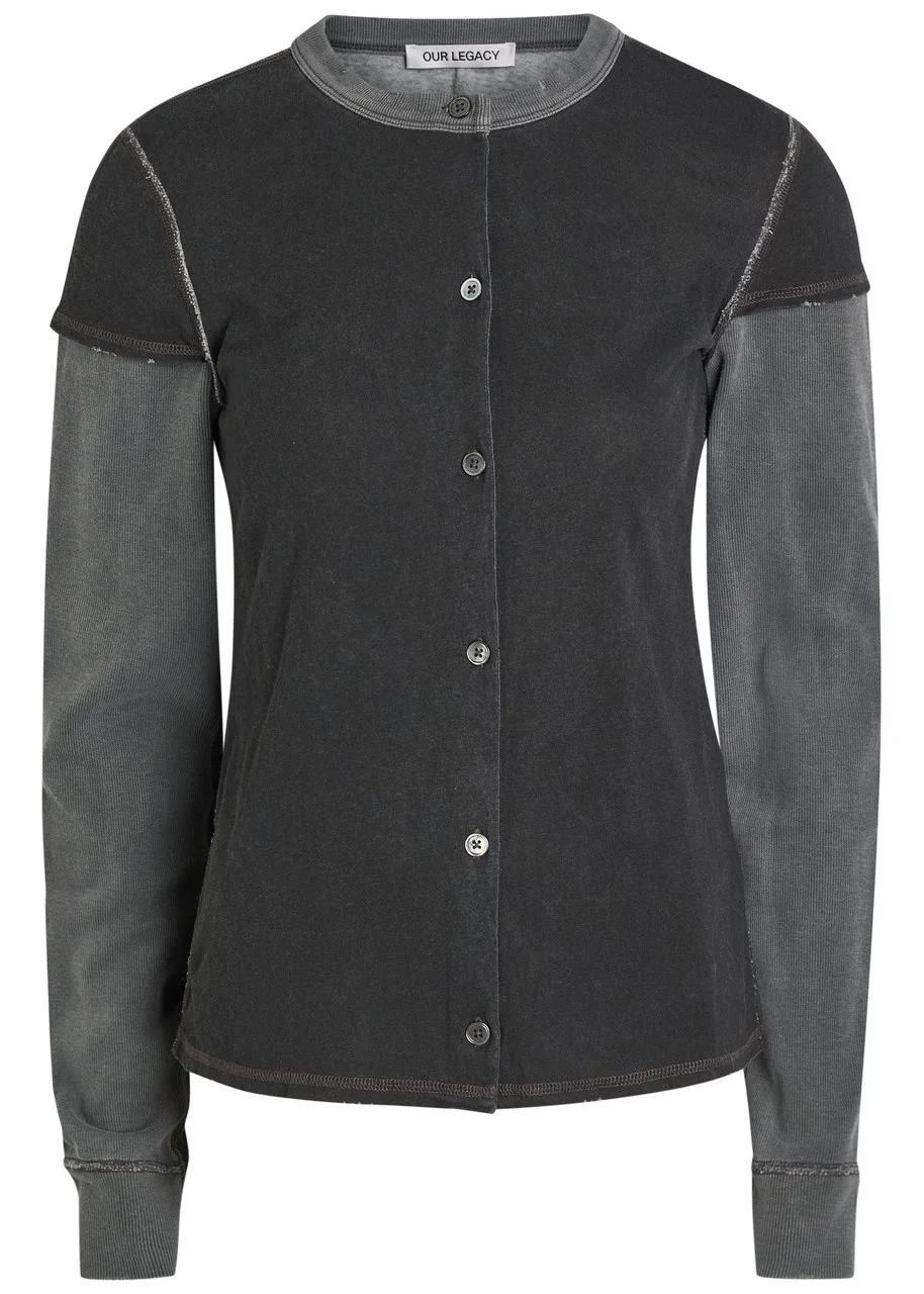 Info & Care Our Legacy cotton top Layered-effect, colour blocked, ribbed crew-neck, exposed seams, distressed details; Button fastenings through front; 100% cotton Machine wash Size & Fit Length shoulder to hem: 23 inches/ 58.5cm Midweight Regular fit Model is 5'9"/ 175cm and wears a size;FR36