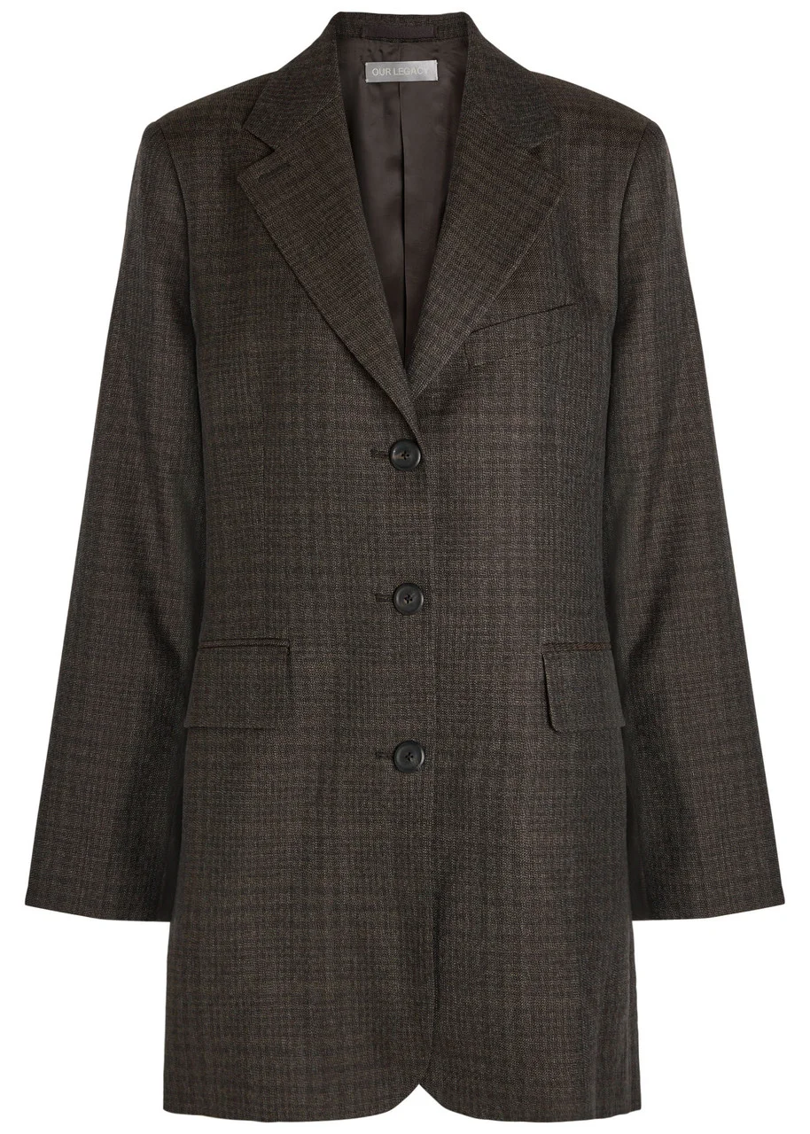 Info & Care Our Legacy wool blazer Plaid jacquard, notched lapels, padded shoulders, button-fastening cuffs, chest slit pocket, front flap pockets, back vent, two internal slip pockets, fully lined Button fastenings through front; 100% wool; lining: 55% viscose, 45% acetate Dry clean Size & Fit Length shoulder to hem: 34 inches/ 86.5cm Midweight Designed to be worn oversized, tailored for relaxed fit Model is 5'9"/ 175cm and wears a size;FR36