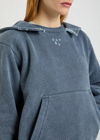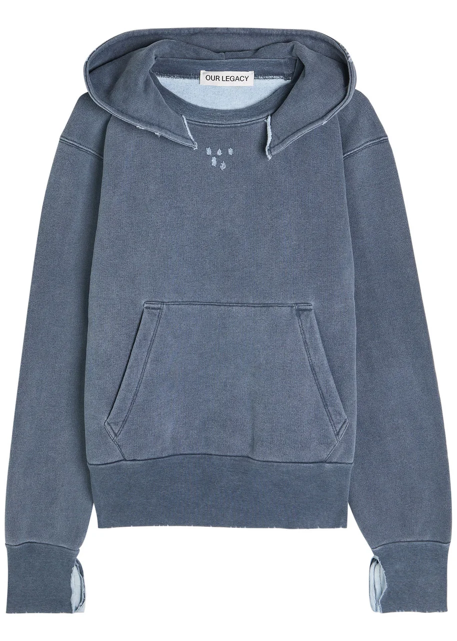 Info & Care Our Legacy cotton sweatshirt Hood with collar trim, dropped shoulders, pouch pocket, ripped and;distressed details, slightly faded finish, terry lining Slips on 100% cotton Machine wash Size & Fit Length shoulder to hem: 24 inches/ 61cm Midweight Relaxed fit Model is 5'9"/ 175cm and wears a size;FR36