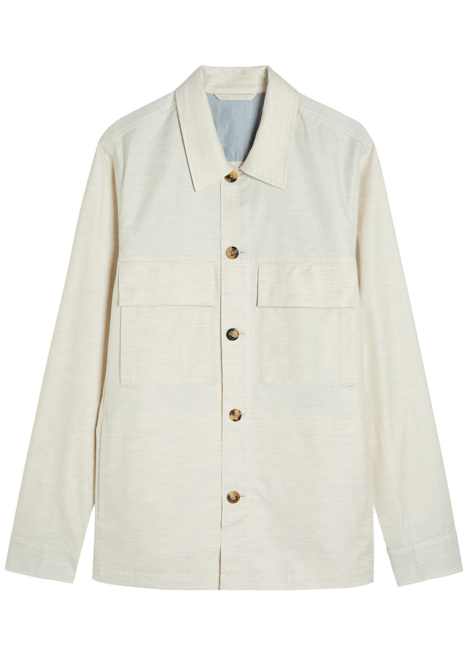 Info & Care Paul Smith cotton;overshirt Melange, button-fastening cuffs, press-stud fastening chest flap pockets, side slip pockets, signature striped tab at back, two internal patch pockets Button fastenings through front 100% cotton Machine wash Size & Fit Length shoulder to hem: 29 inches/ 73.5cm Lightweight Regular fit Model is 6'2"/ 188cm, chest size 38 inches and wears a size medium