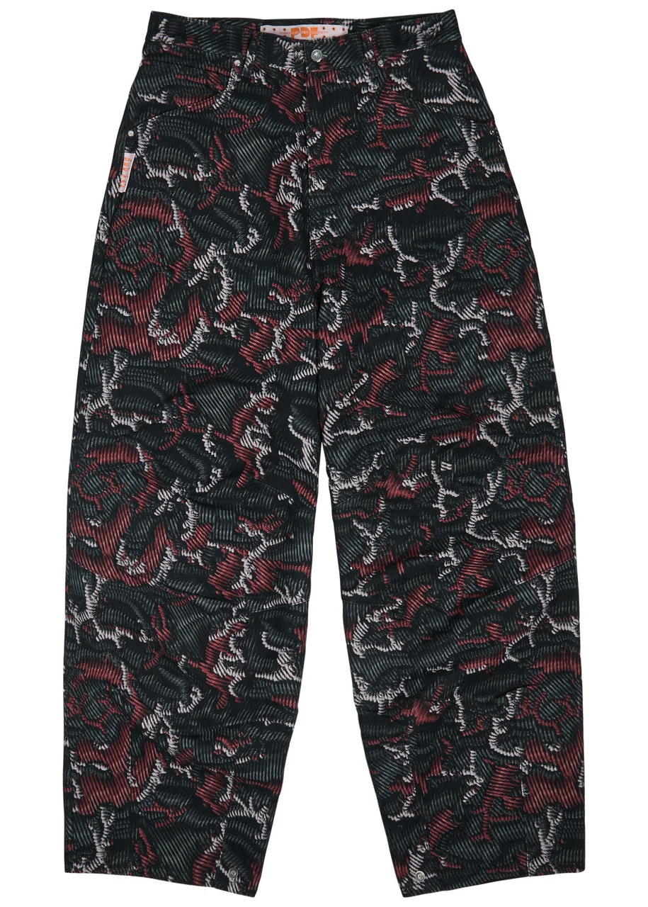Info & Care PDF Channel cotton trousers Patterned, belt loops, three front slip pockets, designer tag at side, darted knees, signature rubberised plaster applique at back, back patch pockets with contrasting applique, adjustable press-stud fastening cuffs Partially concealed zip and button fastening at front 100% cotton Hand wash Coordinating items available Size & Fit Inside leg length: 31 inches/ 79cm Midweight Mid-rise, relaxed barrel-leg cut Model is 6'1"/ 185cm and wears a size;W32
