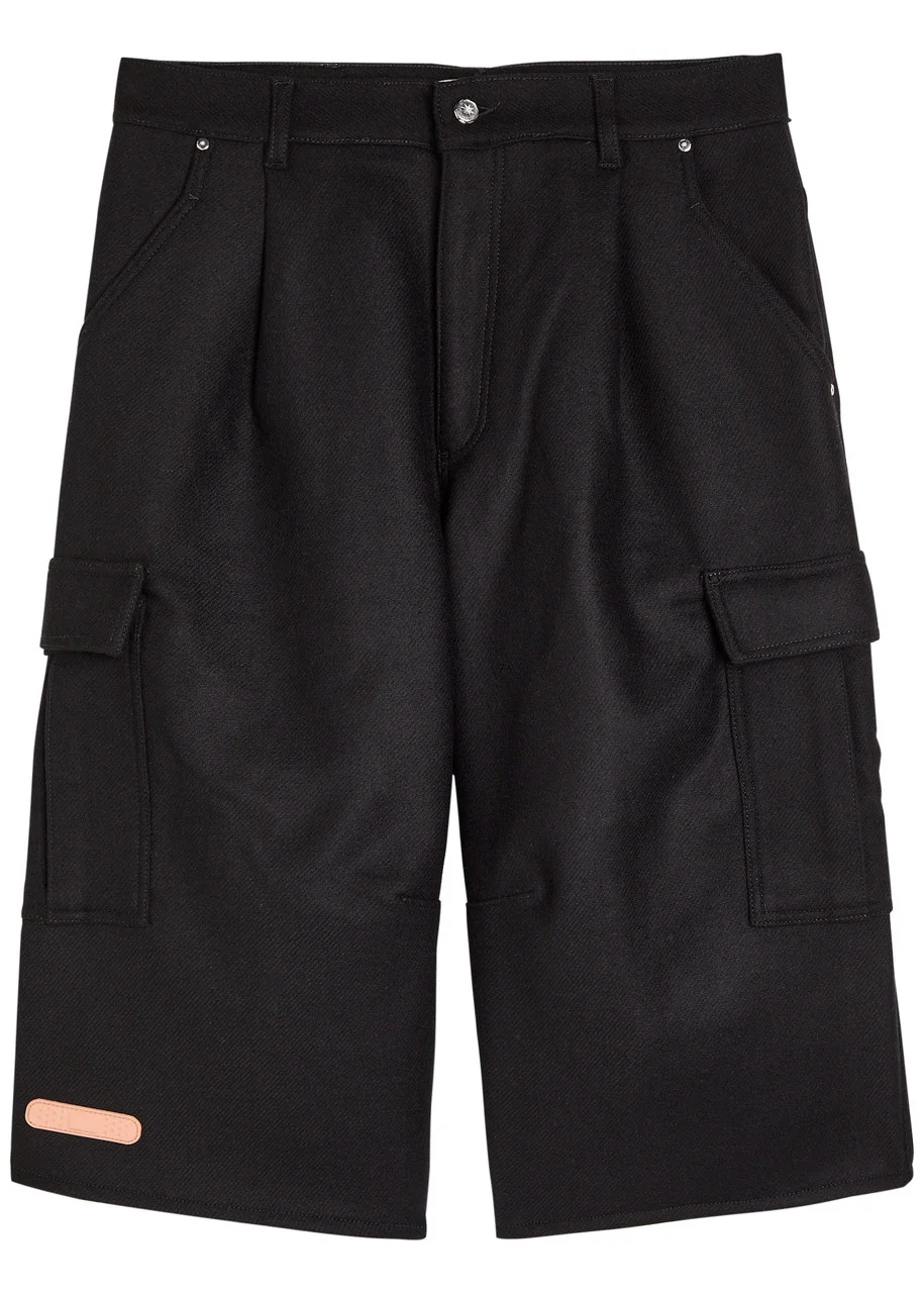 Info & Care PDF Channel wool-blend trousers Belt loops, side slip pockets, pleats at front, press-stud fastening flap pockets at sides, signature rubber plaster-effect plaques, embroidered back patch pockets; Partially concealed zip and button fastening at front 75% virgin wool, 25% polyamide Hand wash Size & Fit Inside leg length: 17 inches/ 43cm Midweight Relaxed fit, cropped Model is 6'1"/ 185cm and wears a size W32