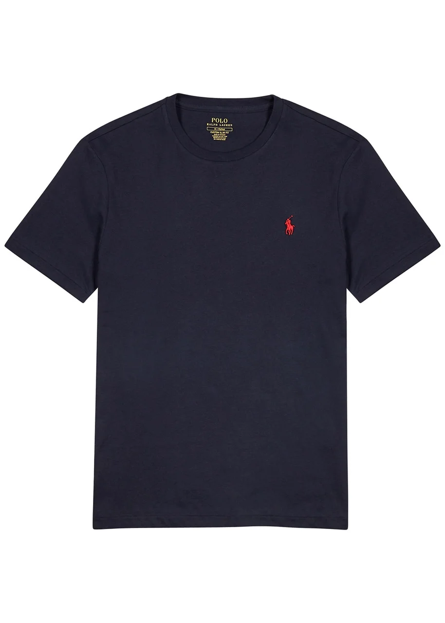 INFO & CARE - Polo Ralph Lauren navy cotton T-shirt - Ribbed crew-neck red embroidered designer crest - Slips on - 100% cotton SIZE & FIT - Machine wash - Length shoulder to hem: front: 26 inches/ 66cm - Midweight - Custom slim fit - Model is 6'3"/ 191cm chest size 38 inches and wears a size medium