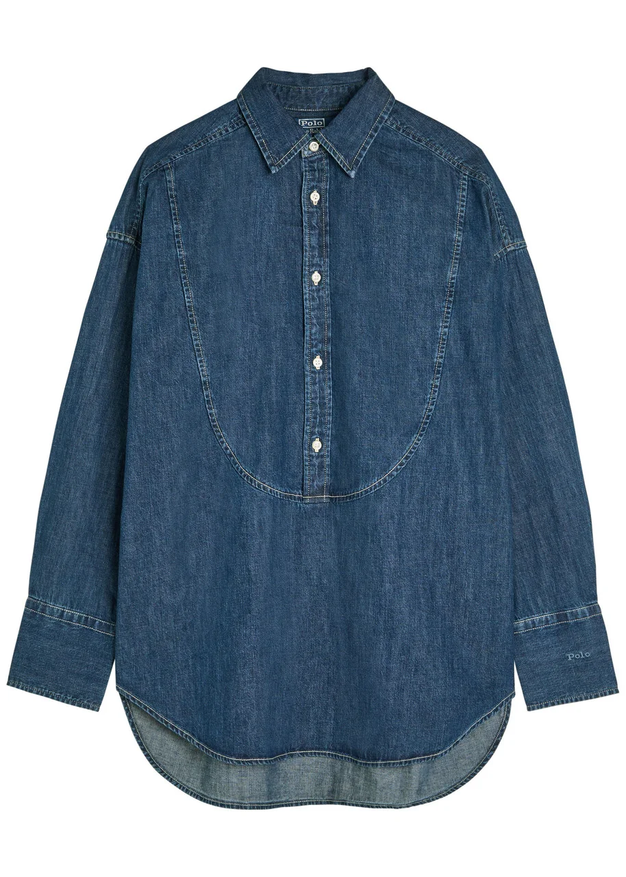 Info & Care Polo Ralph Lauren denim shirt Button-fastening neck, dropped shoulders, button-fastening cuffs, logo embroidery at cuff, box pleat at back, curved hem, longer back hem, contrast stitching, faded finish Slips on 100% cotton Machine wash inside out to avoid colour transfer Size & Fit Length shoulder to hem: 28 inches/ 71.5cm; back: 30 inches/ 76cm Midweight Relaxed fit, tailored for oversized style Model is 5'9"/ 175cm and wears a size small