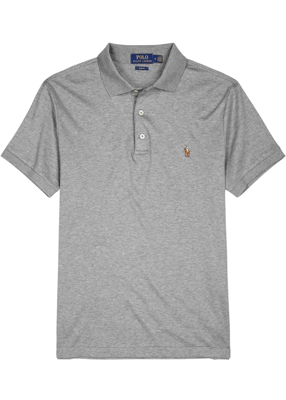 INFO & CARE - Polo Ralph Lauren grey Pima cotton polo shirt - Button-fastening neck embroidered designer crest split sides ribbed trims - Slips on - 100% Pima cotton SIZE & FIT - Machine wash - Length shoulder to hem: 26 inches/ 65cm - Midweight - Slim fit - Model is 6'1"/ 185cm chest size 38 inches and wears a size medium