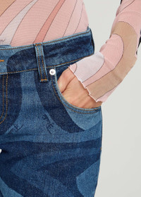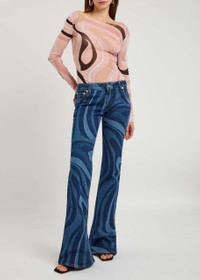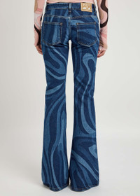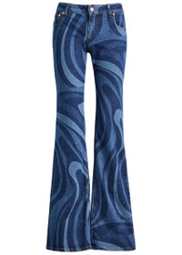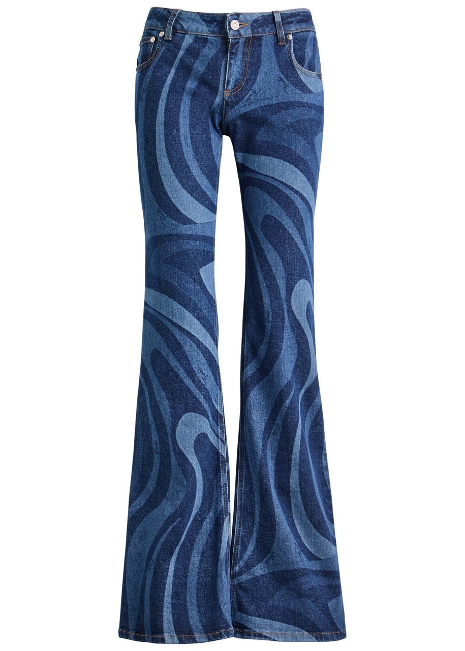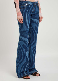 Info & Care Pucci stretch-denim;jeans Low-rise fit, slim flared-leg cut, wave and logo print, belt loops, five pockets, designer plaque at back, contrasting stitching, faded finish Concealed zip and button fastening at front 99% cotton, 1% elastane Machine wash cold inside out to avoid colour transfer Size & Fit Front rise: 8 inches/ 20.5cm Inside leg length: 35.5 inches/ 90cm Midweight Model is 5'9"/ 175cm and wears a size W27