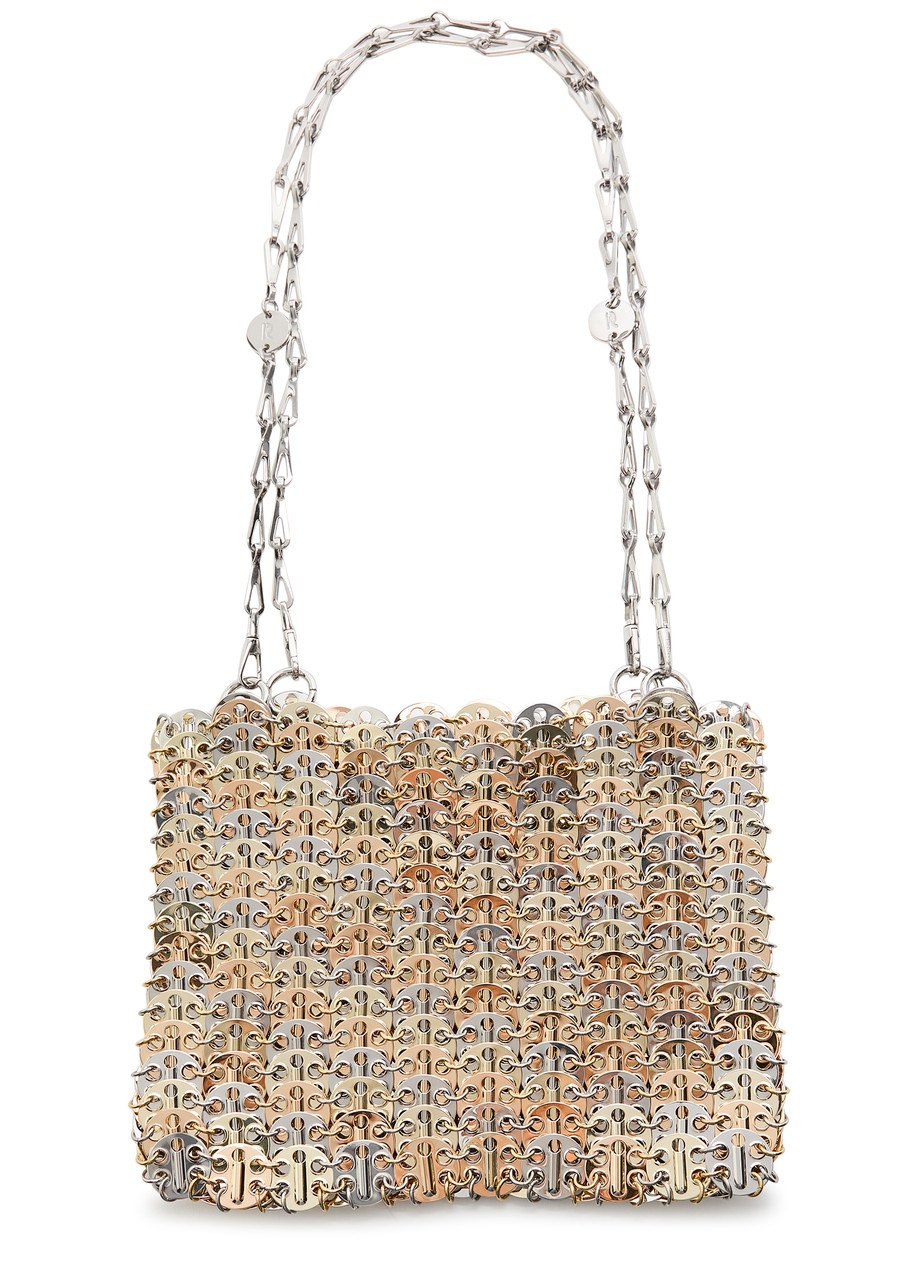 Info & Care Rabanne metal shoulder bag Two chain shoulder straps, linked disc design, designer tag Concealed magnetic fastening at top Presented in a designer-stamped box; Size & Fit Width 8.5 inches/ 21.5cm Height: 7 inches/ 18cm Depth: 1 inches/ 2.5cm Shoulder strap drop: 13.5 inches/ 34cm