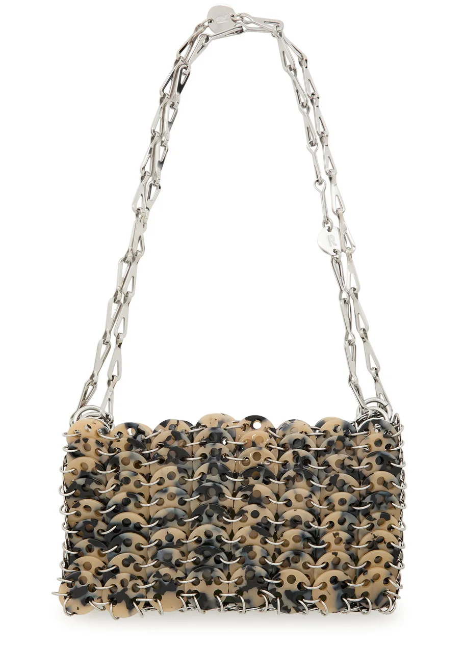 Info & Care Rabanne acetate shoulder bag Adjustable chain shoulder strap, tortoiseshell effect,;nano linked disc design, metal discs at sides, designer-engraved tags Magnetic fastening at top Size & Fit Width: 7 inches/ 18cm Height: 4 inches/ 10cm Depth: 1 inch/ 2.5cm Min. shoulder strap drop: 12 inches/ 30.5cm Max. shoulder strap drop: 21.5 inches/ 54.5cm