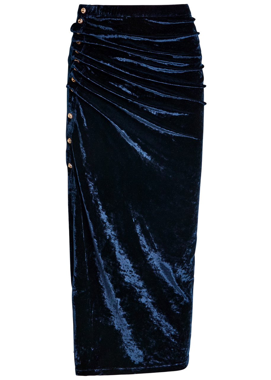 Info & Care Rabanne;velvet;skirt Draped and gathered details, elasticated waistband, crystal-embellished faux buttons, front split Press-stud fastenings at;side 77% viscose, 21% polyamide, 2% elastane; Dry clean Size & Fit Length waist to hem: 35 inches/ 89cm Midweight Close;fit, slim across waist Model is 5'9"/ 175cm and wears a size;FR36