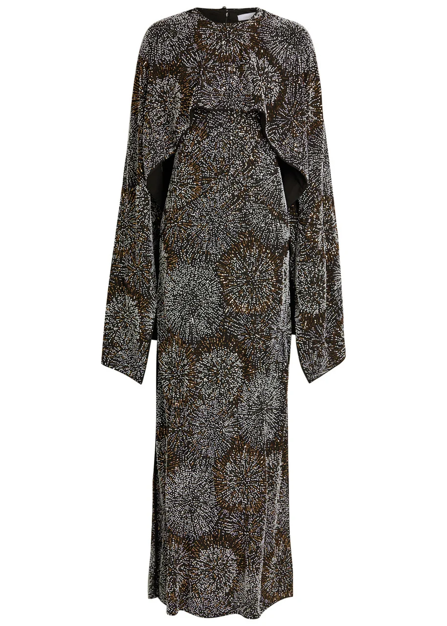 Info & Care Rabanne crepe gown Bead embellishments, detachable button-fastening cape, round-neck, side splits, fully lined Concealed zip fastening;at back; 100% polyester Dry clean Size & Fit Length shoulder to hem: 61 inches/ 155cm Heavyweight Slim bodice, loose from the hips Flared cape overlay Model is 5'9"/ 175cm and wears a size;FR36