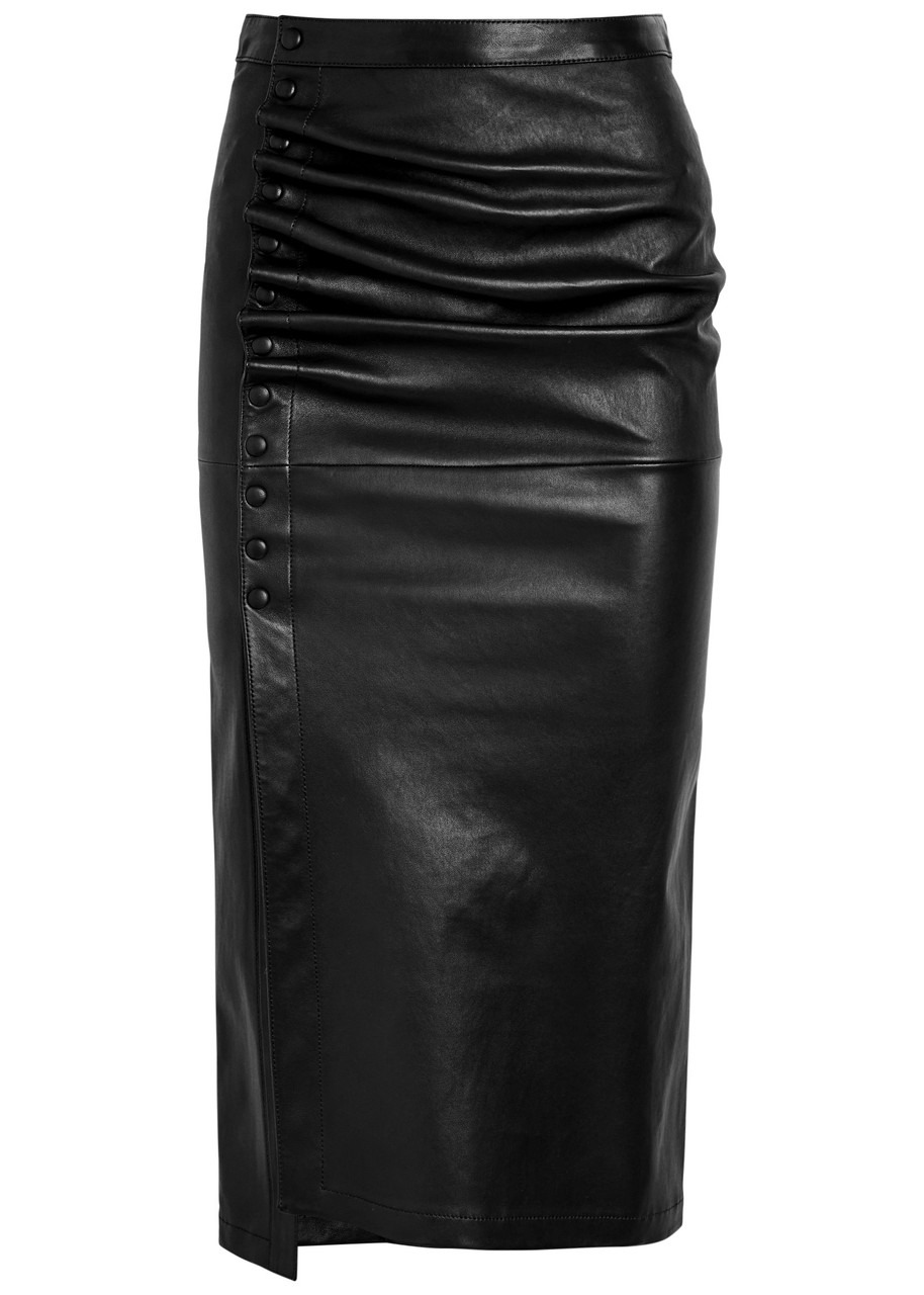 Info & Care Rabanne leather skirt Ruched design,;side split at asymmetric hem Press-stud fastenings at;side 100% lamb leather Specialist;clean Size & Fit Length waist to hem: 1: 30 inches/ 76.5cm; 2: 31.5 inches/ 80cm Midweight Fitted style Model is 5'9"/ 175cm and wears a size;FR36