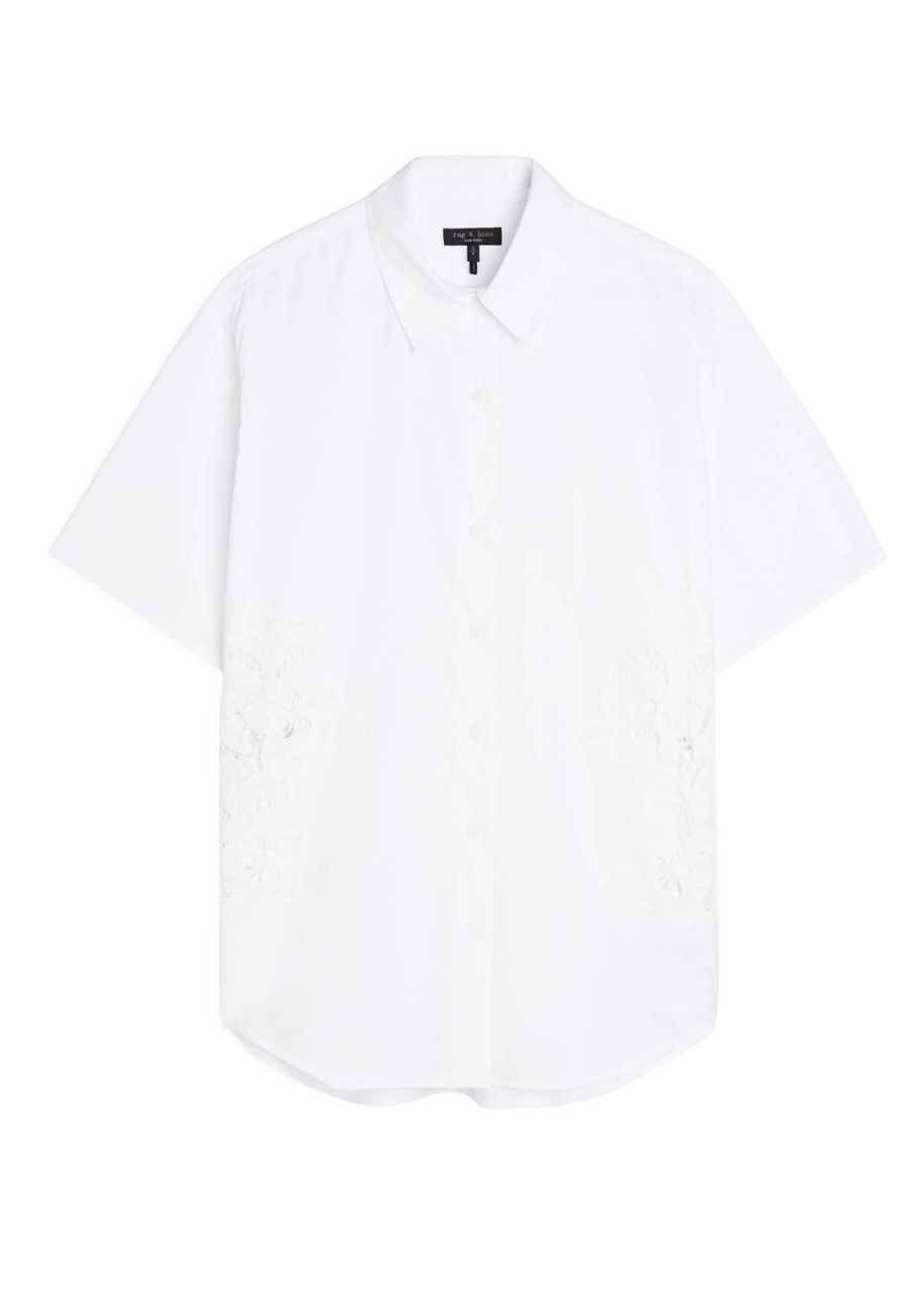 Info & Care rag and bone cotton-poplin shirt; Guipure-lace embroidery, box pleat at back, slightly longer curved back hem Button fastenings through front 100% cotton; Machine wash Size & Fit Length shoulder to hem: front: 27 inches/ 68.5cm; back: 29.5 inches/ 75cm Midweight Slightly relaxed fit Model is 5'9"/ 175cm and wears a size small
