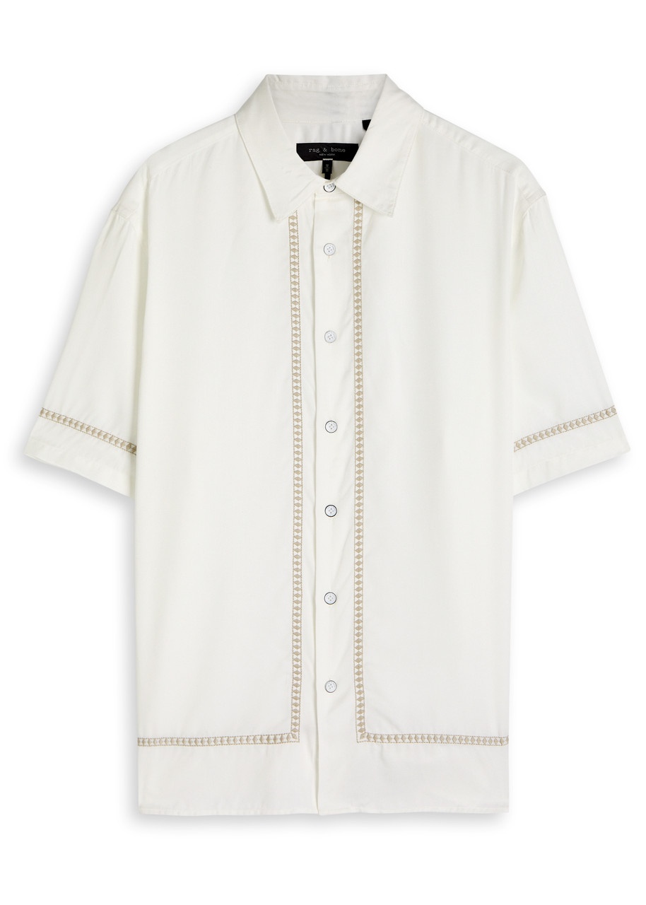 Info & Care rag & bone woven shirt Embroidered, concealed;designer;plaque at front, side splits at hem Button fastenings through front 100% viscose Machine wash; Size & Fit Length shoulder to hem: 27 inches/ 68.5cm Midweight Relaxed fit Model is 6'1"/ 185cm, chest size 38 inches and wears a size medium