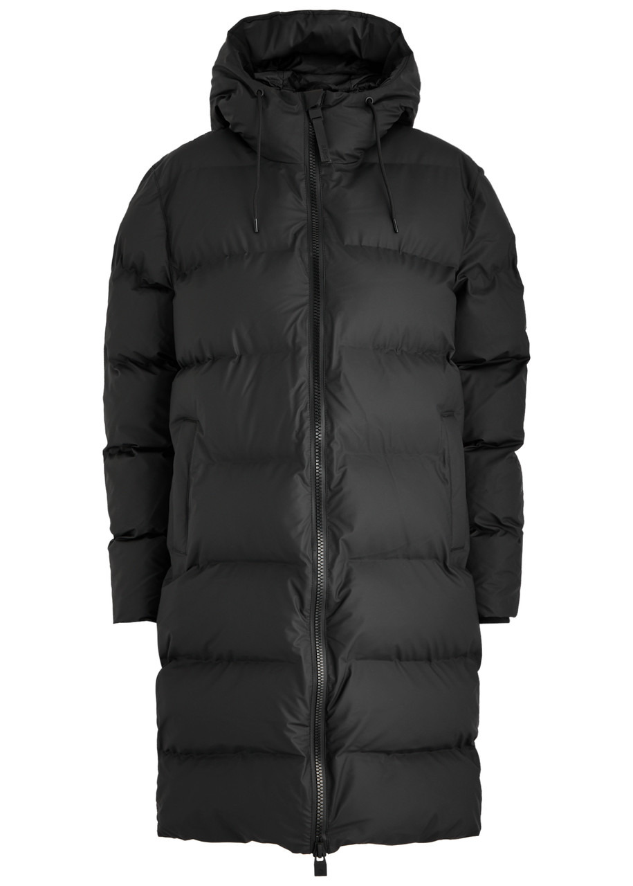 INFO & CARE - Rains rubberised coat - Waterproof, windproof, quilted, drawstring hood, two side slip pockets, debossed rubberised designer plaque, ribbed cuffs, internal zip-fastening pocket, fully lined - Two-way zip fastening through front - 100% polyester; coating: 100% polyurethane; filling: 100% polyester; lining: 100% nylon - Machine wash SIZE & FIT - Length shoulder to hem: 39 inches/ 99cm - Midweight - Relaxed fit - Model is 5'10"/ 178cm and wears a size small