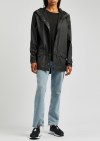 INFO & CARE - Rains hooded rubberised jacket - Waterproof, windproof, drawstring hood with peak, button-fastening neck, two press-stud fastening front flap pockets, designer tag, underarm ventilation eyelets, concealed press-stud fastening cuffs, back storm flap with concealed ventilation cut-outs, back vent, longer back hem, welded seams - Press-stud fastenings through front - 100% polyester; coating: 100% polyurethane - Machine wash SIZE & FIT - Length shoulder to hem: 30 inches/ 76cm; back: 32 inches/ 81.5cm - Midweight - Relaxed, slightly loose fit - Modelis 5'8"/ 172cm and wears a size small