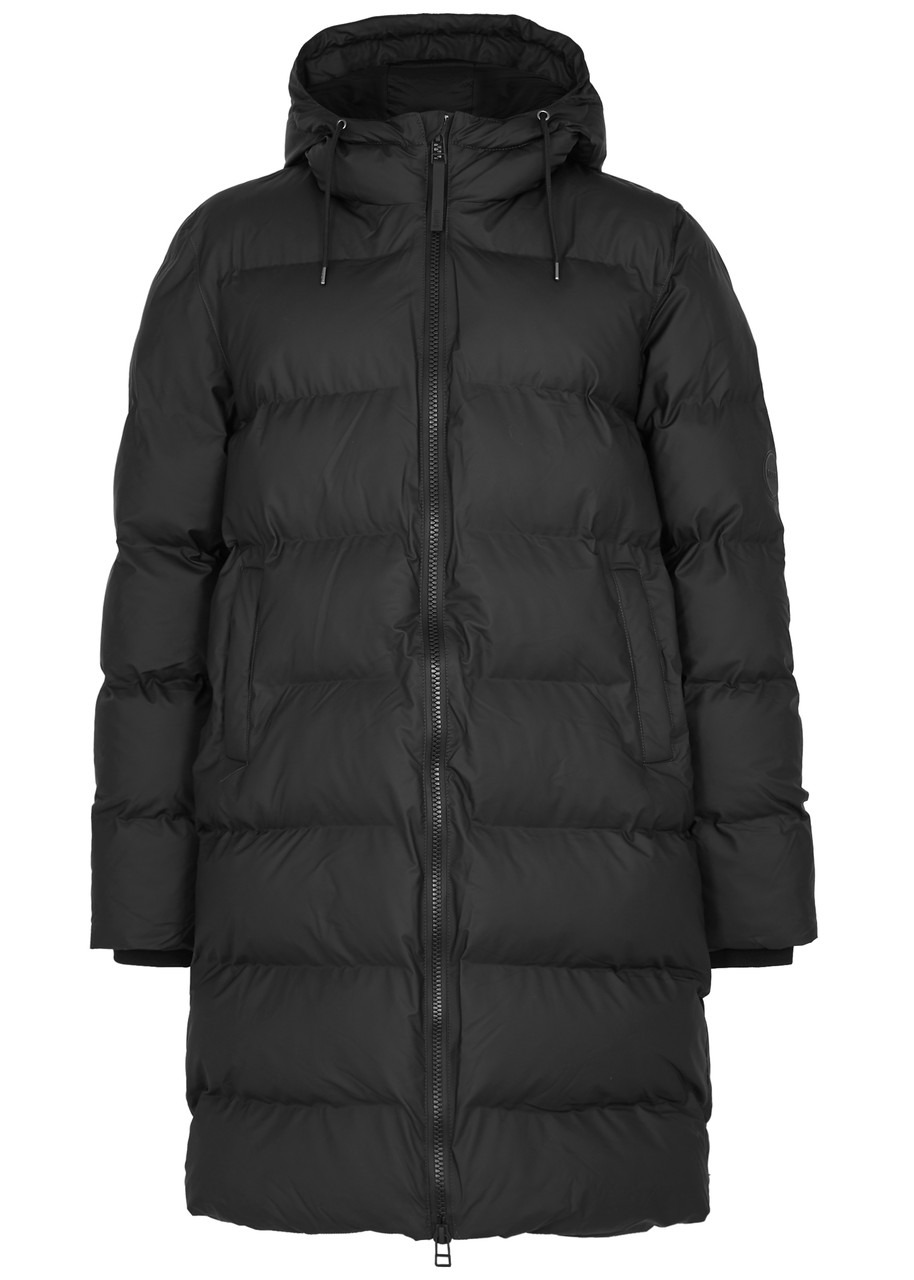 INFO & CARE - Rains rubberised coat - Waterproof, windproof, quilted, drawstring hood, high-neck, designer plaque at sleeve, ribbed-knit cuffs underlay, two slip pockets with fleece lining, longer back hem, fully lined - Zip fastening through front - 100% polyester; coating: 100% polyurethane; lining: 100% nylon; padding: 100% polyester - Machine wash SIZE & FIT - Length shoulder to hem: 40 inches/ 102cm; back: 42 inches/ 106.5cm - Midweight - Relaxed fit - Model is 6'2"/ 188cm, chest size 38 inches and wears a size medium