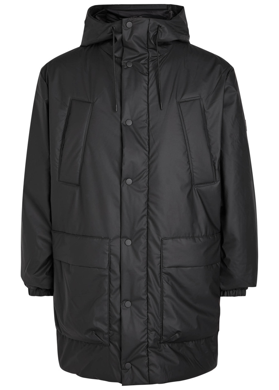Info & Care Rains rubberised jacket Waterproof, windproof, quilted, drawstring hood, designer plaque at sleeve, elasticated;cuffs, chest slip pockets, front flap pockets, internal zip-fastening pocket, fully lined; Partially concealed press-stud and two-way zip fastenings through front; 100% polyester; coating: 100% polyurethane; lining: 100% nylon; padding: 100% polyester Machine wash; Size & Fit Length shoulder to hem: 31 inches/ 79cm Midweight Relaxed fit Model is 6'1"/ 185cm, chest size 36 inches and wears a size medium