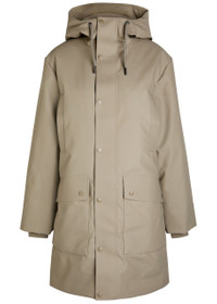Info & Care Rains rubberised parka coat Waterproof, quilted, drawstring hood, ribbed internal cuffs, side slip pockets, push-stud fastening flap pockets, back vent with drawstring hem, internal zip-fastening pocket, fully lined Partially concealed push-studs and two-way zip fastening through front 100% polyester Machine wash Size & Fit Length shoulder to hem: 36 inches/ 91.5cm Heavyweight Relaxed fit Model is 5'10"/ 178cm and wears a size small