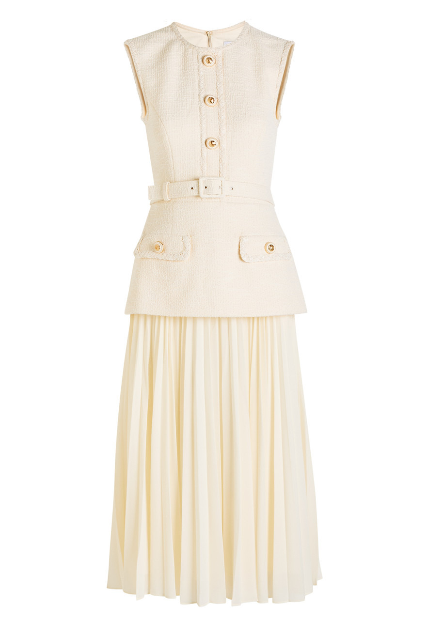 Info & Care Rebecca Vallance tweed and chiffon dress Layered design, round-neck, faux buttons through front, belt loops, detachable belt, darts through waist, faux button-fastening flap front pockets, pressed creases through skirt, sculpted and enamelled hardware, fully lined Partially concealed hook and zip fastening at back; Fabric 1: 87% polyester, 10% cotton, 3% elastane; fabric 2: 100% polyester; lining: 97% polyester, 3% elastane Dry clean Size & Fit Length shoulder to hem: 48.5 inches/ 123cm Midweight Fitted bodice, loose skirt Model is 5'9"/ 175cm and wears a size UK8