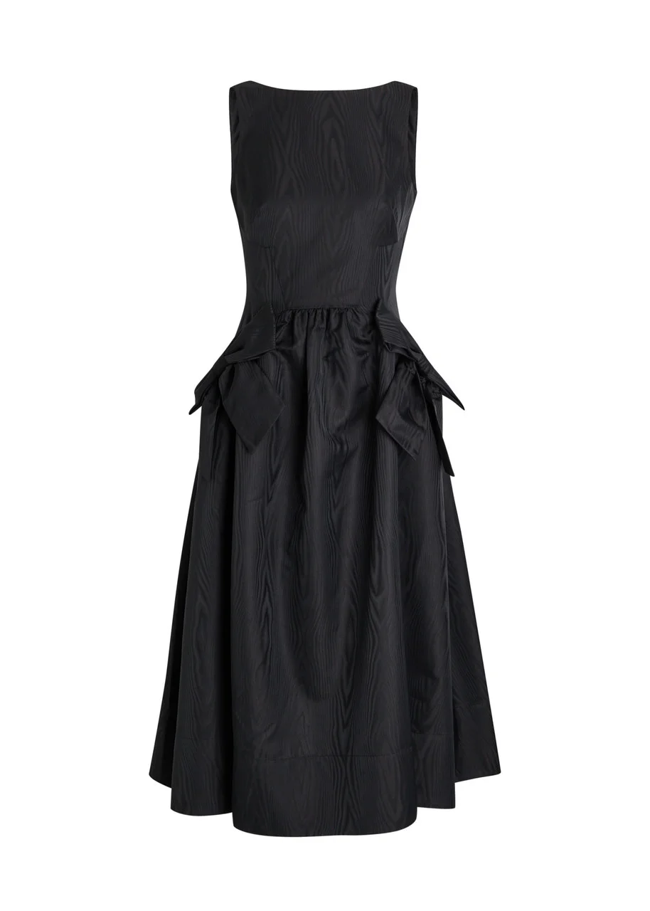 Info & Care Rebecca Vallance taffeta dress Moire jacquard, wide-neck, bow embellishments, side slip pockets, fully lined Concealed hook and zip fastening at back 100% polyester; lining: 97% polyester, 3% elastane Dry clean Size & Fit Length shoulder to hem: 48 inches/ 122cm Midweight Slim fit bodice, full flared skirt Model is 5'10"/ 178cm and wears a size;UK8