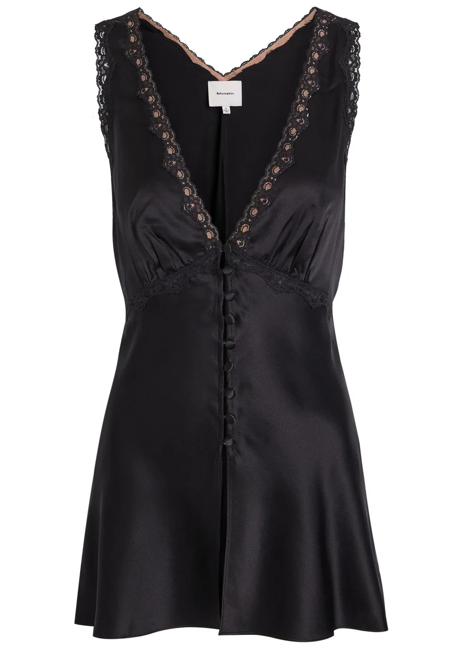Info & Care Reformation silk top V-neck, scalloped lace trims, ties at back waist, partially lined Button fastenings through front 100% silk; lining: 100% viscose Dry clean; Size & Fit Length shoulder to hem: 28 inches/ 71cm Midweight Slim bodice, flared hem Use ties to cinch waist Model is 5'10"/ 178cm and wears a size UK8
