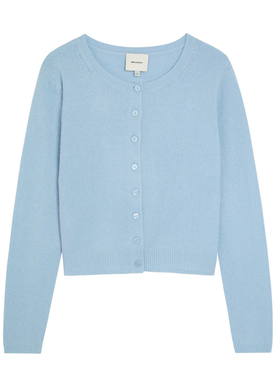 Info & Care Reformation cashmere cardigan Crew-neck, ribbed trims Button fastenings through front 95% recycled cashmere, 5% cashmere Hand wash Size & Fit Length shoulder to hem: 20 inches/ 51cm Midweight Relaxed fit, boxy style Model is 5'10"/ 178cm and wears a size small
