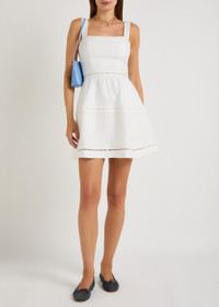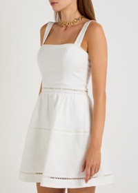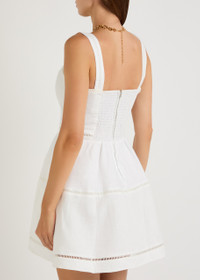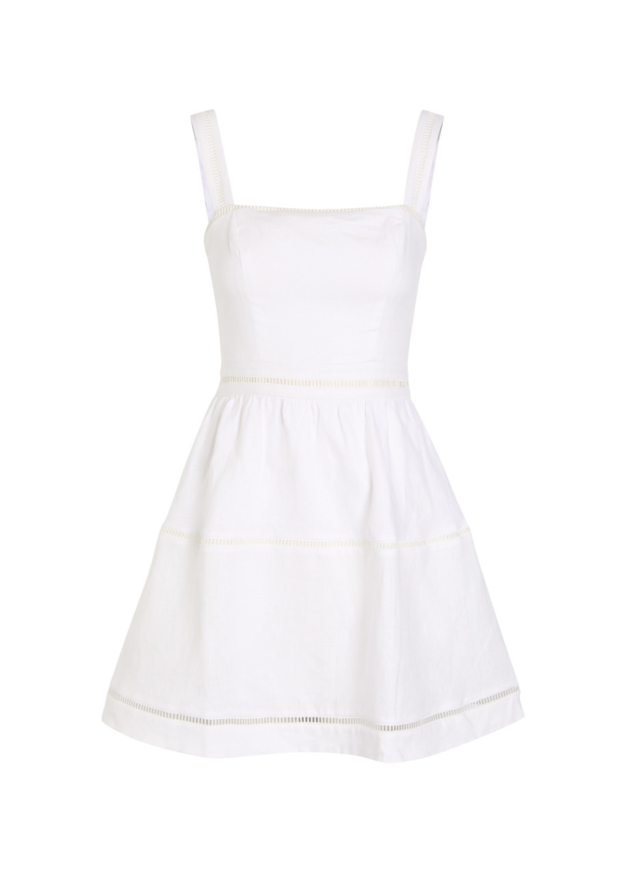 Info & Care Reformation linen dress Square neck, darted bodice, gathered details at waist, side slip pockets, laddered inserts, smocked panel at back, fully lined Zip fastening at back 100% linen; lining: 100% organic cotton Machine wash Size & Fit Length shoulder to hem: 33 inches/ 84cm Midweight Slim fit, flared from waist Model is 5'9"/ 175cm and wears a size US4