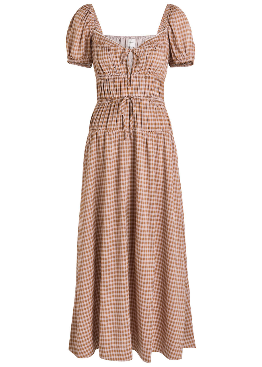 Info & Care Reformation woven dress Checked, sweetheart-neck with picot lace trim, elasticated shoulders, cuffs and bodice, puffed sleeves, drawstring at bust and waist, keyhole at bust, fully lined; Slips on 52% LENZING™, ECOVERA™ viscose, 48% organic cotton; lining: 100% rayon Machine wash Size & Fit Length shoulder to hem: 51 inches/ 129.5cm Midweight Slim fit bodice Loose from the hips, A-line cut Model is 5'8"/ 173cm and wears a size;US4