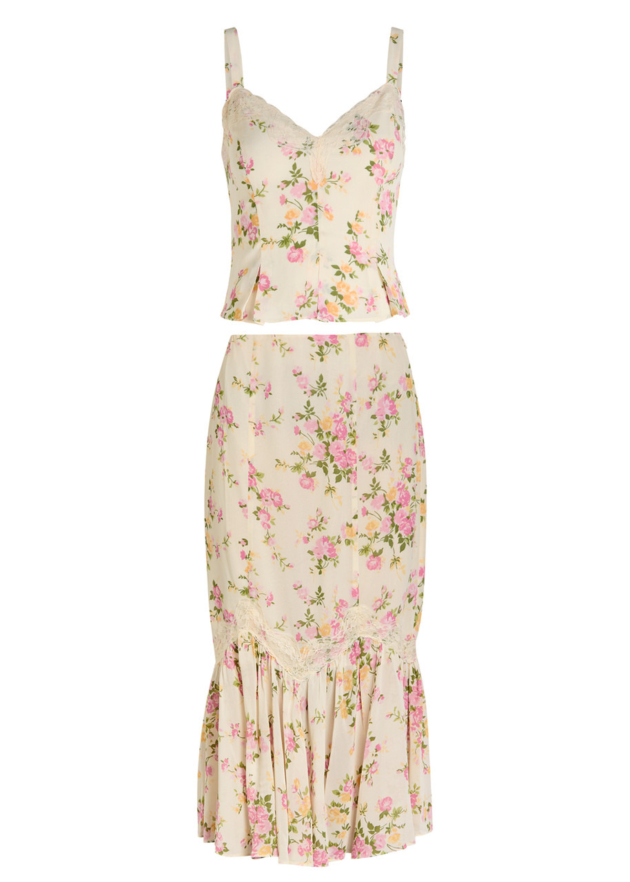 Info & Care Reformation georgette top and skirt set Top: floral print, adjustable shoulder straps, V-neck with lace trim, smocked panel at back, inverted pleats at hem, fully lined, concealed zip fastening at side Skirt: floral print, elasticated waistband, scalloped lace panel with gathered details, fully lined, concealed zip fastening at side 100% viscose Dry clean Size & Fit Length shoulder to hem: 18.5 inches/ 47cm Length waist to hem: 33 inches/ 84cm Midweight Slim fit top Flared hem skirt, slim across waist Model is 5'9"/ 175cm and wears a size US4