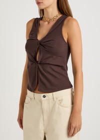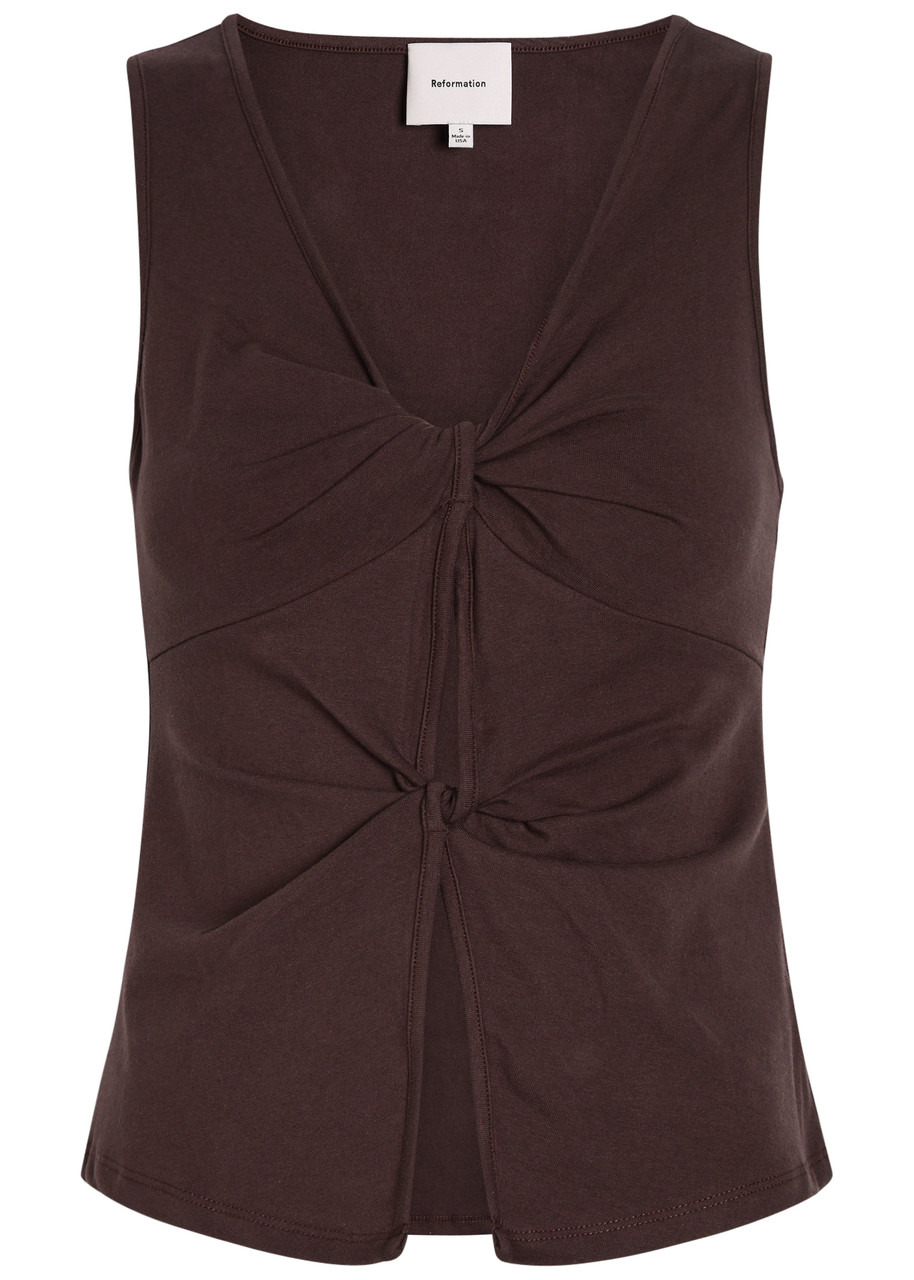 Info & Care Reformation stretch-cotton top V-neck, knotted and cut-out details at front; Slips on 88% organic cotton, 12% spandex Machine wash Size & Fit Length shoulder to hem: 20 inches/ 51cm Midweight Slim fit Model is 5'9"/ 175cm and wears a size small