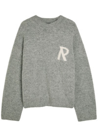 Info & Care Represent alpaca-blend jumper; crew-neck, dropped shoulders, brand intarsia, ribbed trims, brushed finish; Slips on; 56% alpaca, 21% acrylic, 20% nylon, 3% elastane Hand wash; Size & Fit Length shoulder to hem: 28inches/ 71cm; Midweight Relaxed fit Model is 6'2"/ 188cm, chest size 38 inches and wears a size medium