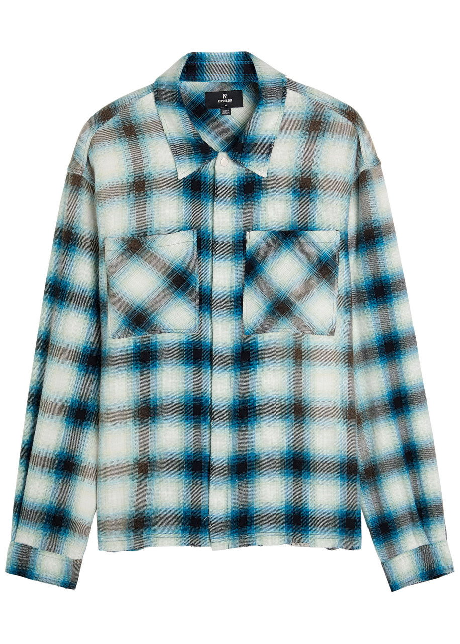 Info & Care Represent flannel shirt Checked, push-stud fastening cuffs, front patch pockets, designer plaque at hem, longer back, distressed details Push-stud fastenings through front 100% cotton Machine wash Size & Fit Length shoulder to hem: front: 27 inches/ 68.5cm; back: 29 inches/ 73.5cm Midweight Relaxed fit Model is 6'1"/ 185cm, chest size 38.5 inches and wears a size medium
