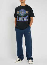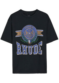 Info & Care Rhude cotton;T-shirt Designer-printed front, ribbed crew-neck, dropped shoulders Slips on 100% cotton Machine wash Size & Fit Length shoulder to hem: 28 inches/ 71cm Midweight Designed to be worn oversized, cut for loose fit Model is 6'1"/ 185cm, chest size 38.5 inches and wears a size medium