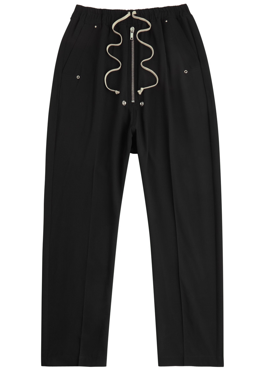Info & Care Rick Owens wool trousers Elasticated drawstring waistband, zip-fastening fly, dropped crotch,;side;slip pockets, stud and eyelet embellishments, pressed creases through legs, two press-stud fastening flap pockets at back; Pull on; 100% wool Hand wash; Size & Fit Inside leg length: 29 inches/ 73.5cm Midweight; Tapered cut, dropped crotch Model is 6'2"/ 188cm and wears a size IT48